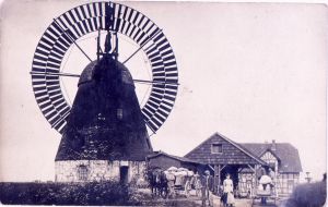 Die Fotografie zeigt die letzte Baufassung der "Windmühle auf dem Berge" etwa um 1920. Zusehen ist Windmüller Albert Busse mit seiner Tochter Alma, einem Müllergesellen und weiteren Mahlgästen. Albert Busse, der in Feldbergen bei Hildesheim ebenfalls eine Windmühle betrieb und die Mühle bereits 1923 wieder verkaufte, stattete die Windmühle noch mit einem großen Turbinenrad aus, zusätzlich konnte sie auch im Falle einer Windflaute mit einem Motor betrieben werden. Im Spätsommer des gleichen Jahr brannte die Windmühle während eines heftigen Gewitters ab und wurde dann später nicht wieder aufgebaut.
