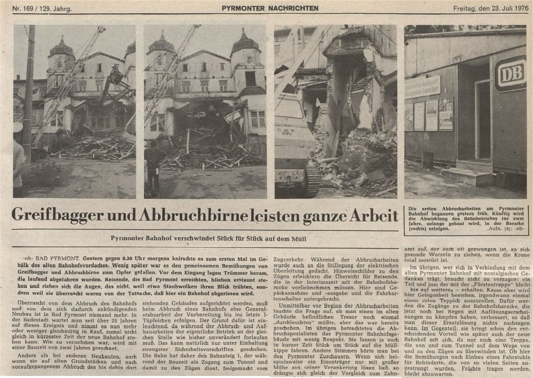 Bericht Pyrmonter Nachrichten vom Abriss des Bahnhofs vom 23.07.1976