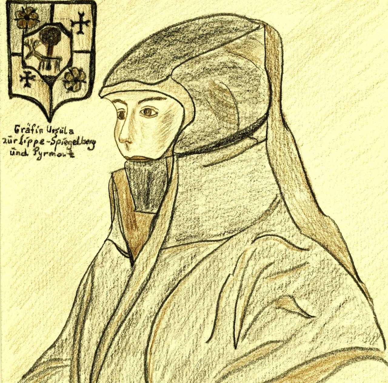 Gräfin Ursula von Spiegelberg und Pyrmont, 1558 verheiratet mit Graf Hermann Simon zur Lippe. Zeichnung nach alten Vorlagen