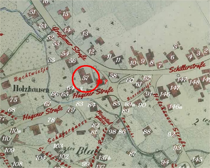 Lage von Gasthaus Sorgenfrei auf Ortsplan (1857)