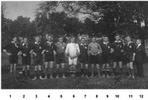 Das Vereinslokal war das Gasthaus Sorgenfrei. Erwin Kinkeldey, selbst ein ehemaliger Fußballer, nannte mir einige Namen von Spielern, an die er sich noch erinnern konnte, denn Unterlagen sind leider nicht zu finden. Robert Röwer, Ede Glases, er war der Sohn des Gastwirtes von Sorgenfrei, verzog später nach Herne, wo er in der Oberliga West bei Westfalia Herne spielte, sein Bombenschuss war von allen Torwarten gefürchtet. Albert Binder, Willi Jänich, Karl Jänich, Willi Schmidt – genannt Doktor –, Rudolf Hunecke, August Hunecke, H. Düvel aus Reher, Heinrich Dülm, und als Betreuer Buchdrucker Fritz Hilker, sicher waren es bestimmt noch einige mehr, was leider nicht mehr festzustellen ist. Abgebildet sind (v.l.n.r):