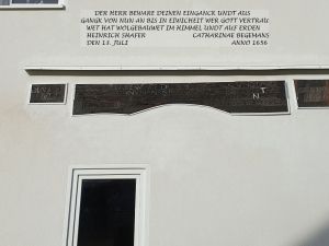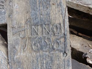 Beim Abriss des linksseitigen Gebäudeteils vor einigen Jahren wurde völlig überraschend in der nordseitigen Fassade des Abrisshauses ein alter Dielenbalken aus dem Jahre 1656 gefunden. Man hatte also das heute noch existierende Haus einfach direkt an die ehemalige Frontseite des alten Gebäudes angebaut und dabei den alten Dielenbalken vollständig eingemauert. Der heutige Besitzer hat dankenswerterweise den Dielenbalken aufarbeiten und in die Südseite seines Hauses einfügen lassen. So ist er erfreulicherweise nicht der Vernichtung anheim gefallen.