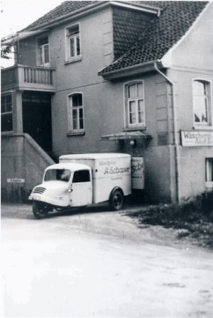 Durch den abgebildeten Lieferwagen, einen Goliath GD 750, lässt sich die Aufnahme frühestens auf den Anfang der 1950er Jahre festlegen.