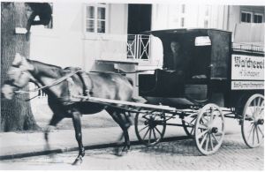 Mitarbeiterinnen posieren vor dem Pferdewagen, mit dem die gewaschene Wäsche ausgeliefert wird. Rechts im Bild Herr Schaper