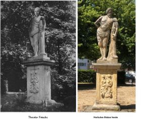 - Herkules sammt Sockel steht heute in der Bombergallee. Vielfachen Dank an Hans-Joachim Weiß, dass er für das aktuelle Foto rechts extra sein zweirädriges eHorse sattelte 😉