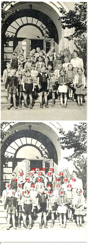 1-Gerd Danziger, 2-Karlchen Lemke, 3-Dieter Bungenstock?, 4-Sighart Nehring, 5-Axel Bender, 6-Marlies Steinwedel, 7-Karin Maris, 8-Werner Schiller, 9-Willi Schmidt, 10- Rüdiger Trippelmann?, 11-Günter Breitmaier, 12-Iris Schulte, 13-Ilse Knobloch, 14-?, 15-Karlheinz Hundermark, 16-Kurt Henne, 17-Wendula von Ulmenstein, 18-Anneliese Böke, 19- Fräulein Mitzlaff, 20-Manfred Reker, 21-?, 22-Eduard Klenke, 23 Gudrun Aschmuteit, 24 Feelein Felicitas Oelkers, 26 ?, 27 Edda Pöhler, 28 ?, 29 Ursel??