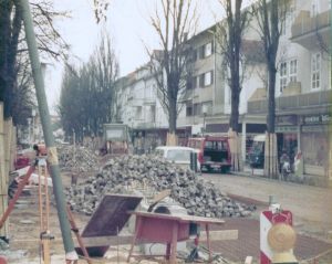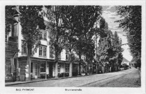 Durch die Feuchten Wiesen, so hieß der Bereich östlich des heutigen Brunnenplatzes, führte ein Weg zur Oesdorfer Kirche. An dieser Neustraße waren seit 1668 etliche Logierhäuser entstanden, sodaß 1720 Fürst Friedrich Anton, wenn auch mehr aus steuerlichen Gründen, den aufstrebenden Ort zur Neustadt Pyrmont machte. Als Namen waren zuvor Brunnengass, bis 1729 Steinweg und bis 1802 Hauptstraße gebräuchlich, bis eine Straßennamenkommission 1802 den bis heute gültigen Namen Brunnenstraße beschloss. [2]