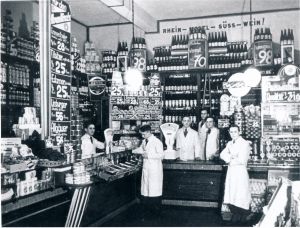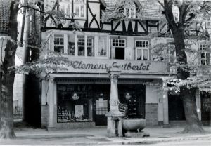 Wohn- und Geschäftshaus in der Brunnenstraße 10, hier Lebensmittelgeschäft des Kaufmanns Clemens Gutberlet, dessen Stammhaus sich seit 1919 in der Neuen Marktstraße in Hameln befand. Gutberlet verstarb 75jährig im Oktober 1965. Später, ab 1969, hatte hier Dieter Kaltenborn sein Schirmgeschäft